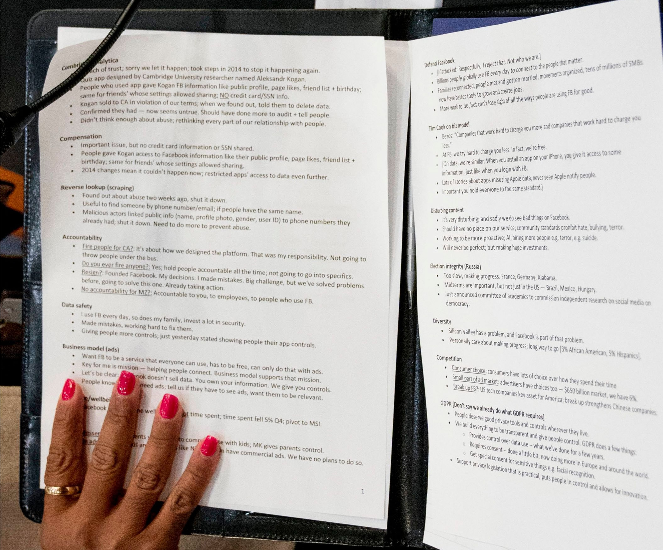 Part of the Facebook team’s strategy was to depict the platform’s use of personal data as limited and safe. Photos of Zuckerberg’s notes for the hearing showed the following prompt: “Let’s be clear. Facebook does not sell data.” He attempted to push the narrative that Facebook only helps advertisers reach particular markets via targeted ads on the platform. His anodyne example was a skiwear company trying to connect with women skiers. It’s an example that’s hard to find fault with – what skier would be offended at seeing skiing products on their feed? – particularly as Zuckerberg claimed the backing of research proving that if people have to see ads, they prefer to see them for relevant items.